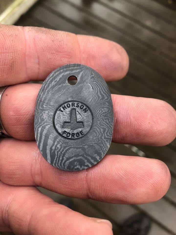 The Thorson Forge Damascus Dog Tag makes a great custom necklace pendant, key chain or the end of your knife’s lanyard.