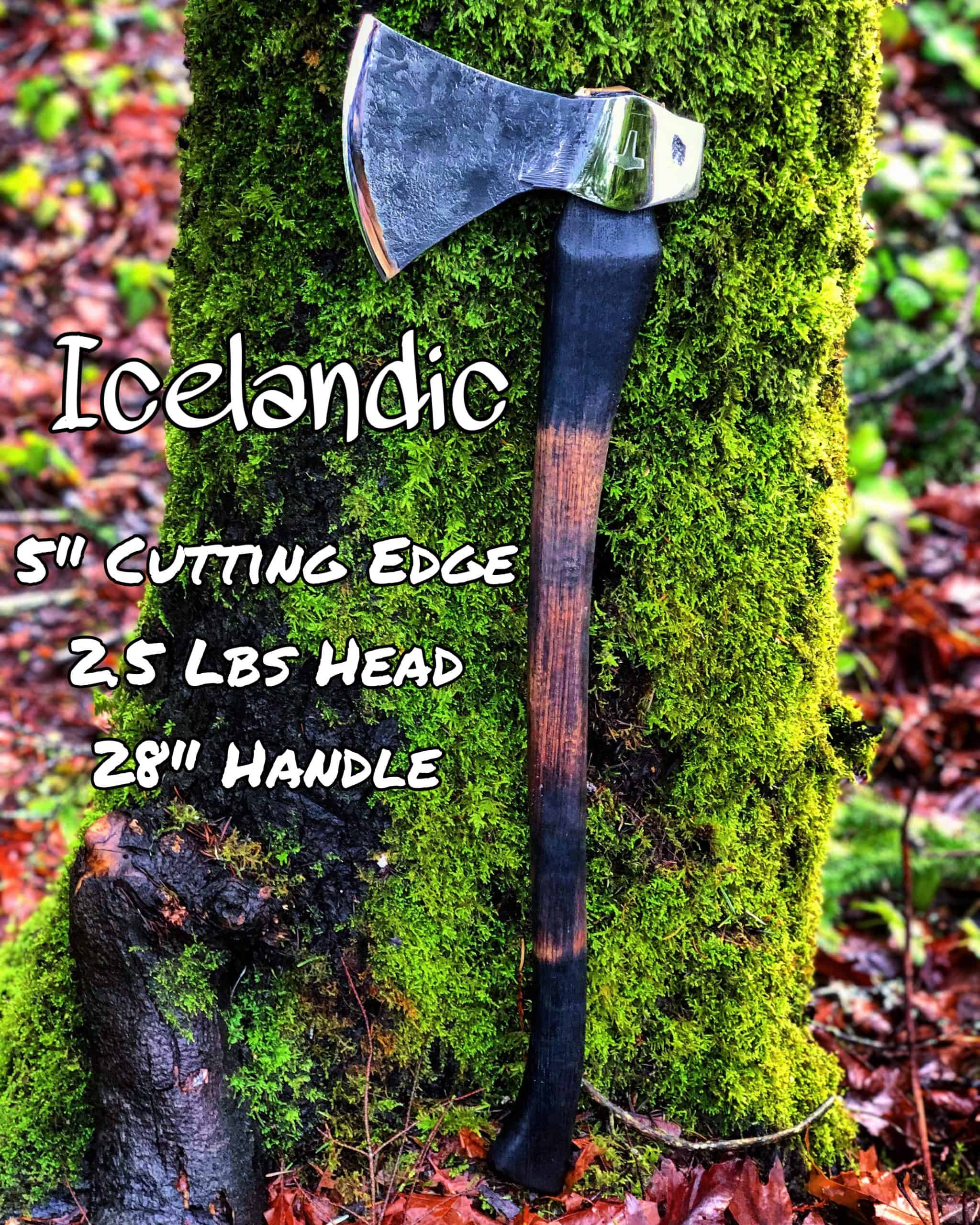 The Icelandic is a 2.5lbs single bit axe head with a 28” curved handle. This combination is commonly known as a boy’s axe, but don’t let that classification fool you; this mid-sized tool is great for light duty axe chores around the fire pit, campsite, or as an emergency tool kept in your vehicle. The curved American Hickory handle is supple enough to absorb the mightiest of blows, yet rigid enough to throw chips like a boss! If you are looking for an axe that is as versatile as it is unique, then the Icelandic Axe is the perfect tool for you.
